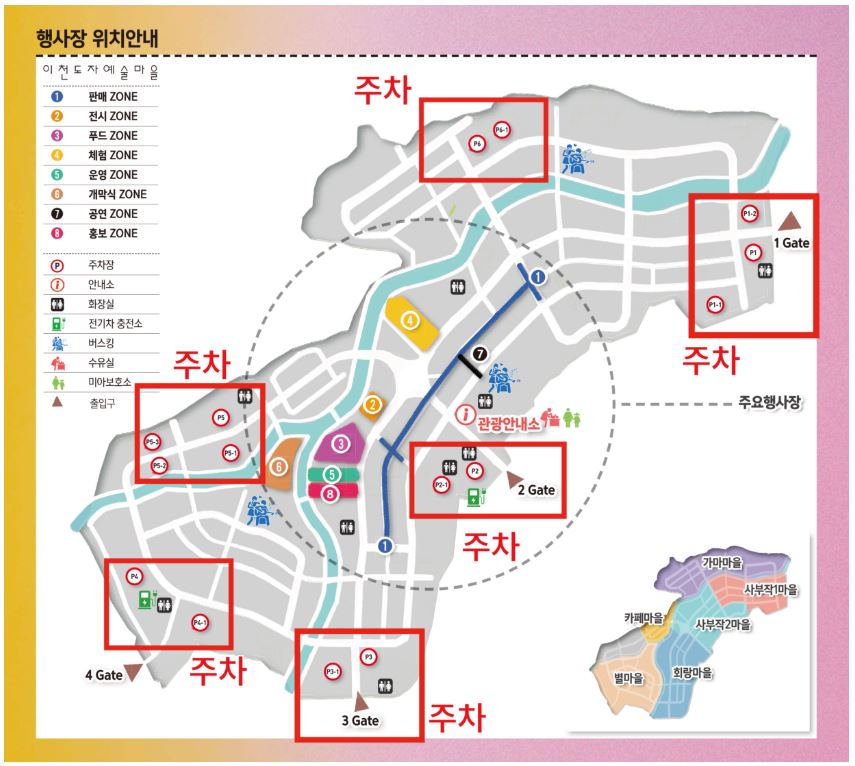 - 이천 세라피아 인근에는 임시 공영주차장이 마련됩니다. 도보로 행사장까지 접근이 가능하며, 주말에는 빠르게 만차될 수 있으니 이른 시간에 도착하시는 것이 좋습니다.